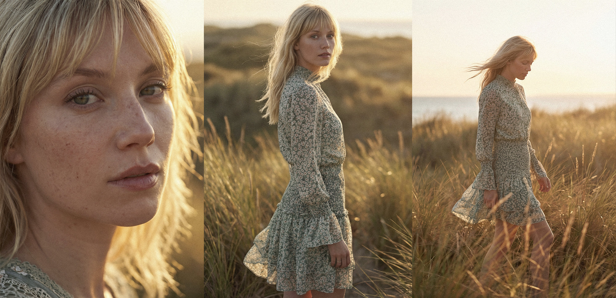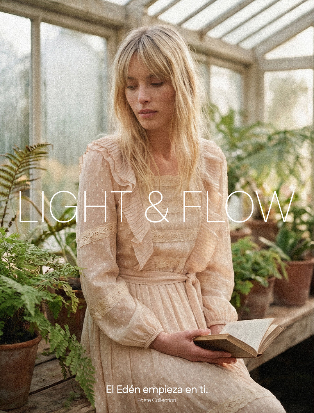 Una cápsula inspirada en la belleza serena de la naturaleza cuando comienza a despertar. Verdes suaves, estampados florales delicados y siluetas fluidas construyen una propuesta femenina, atemporal y luminosa.