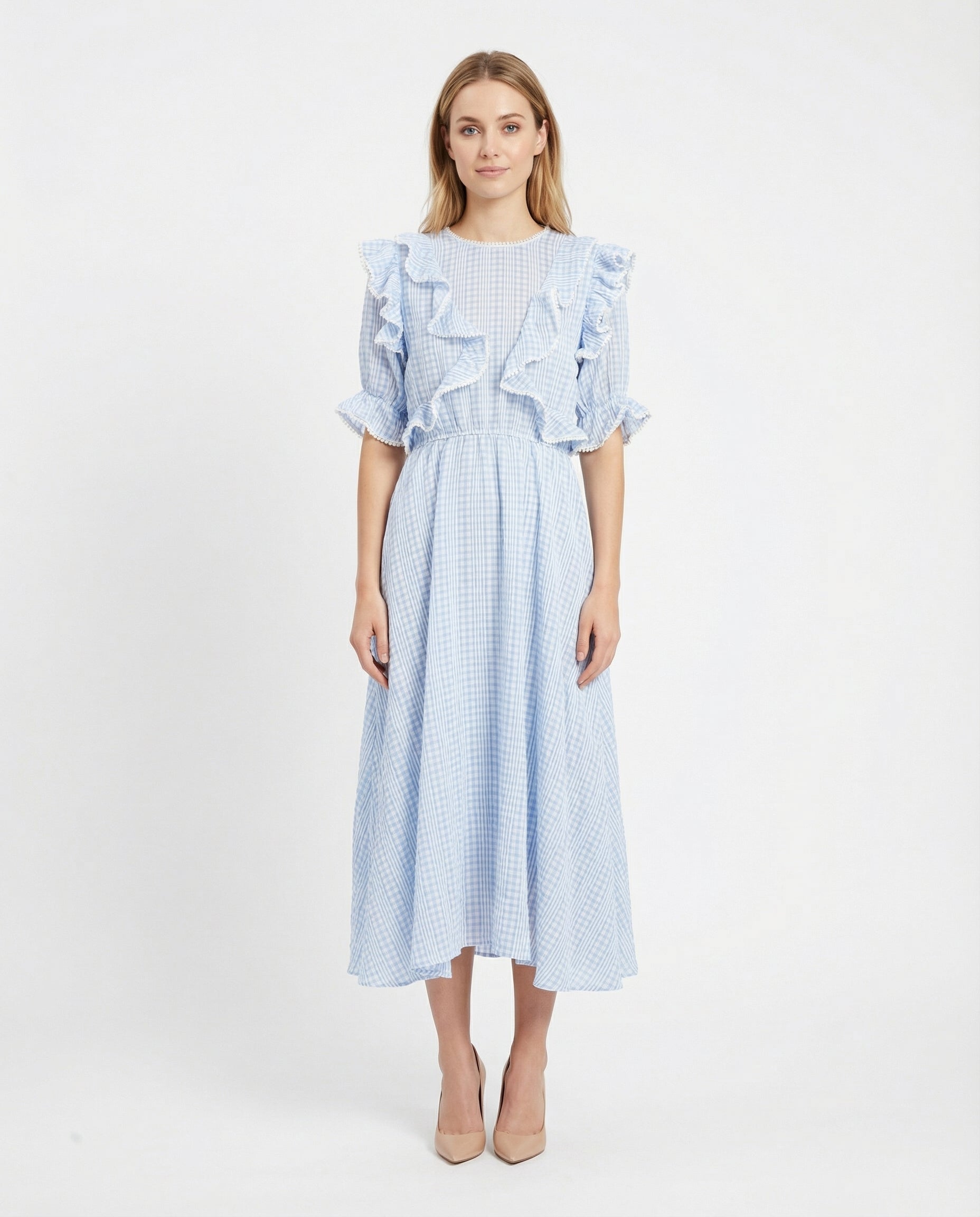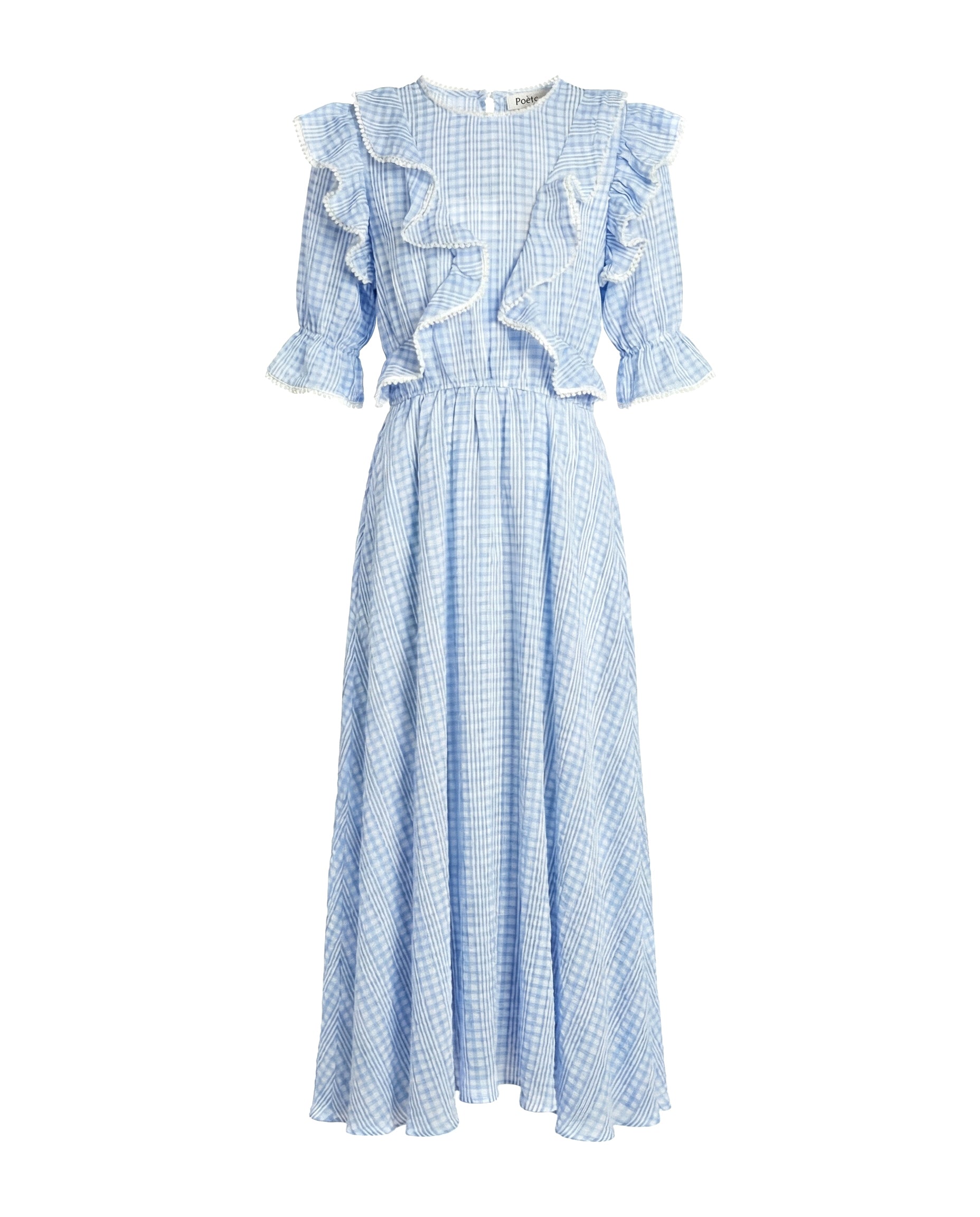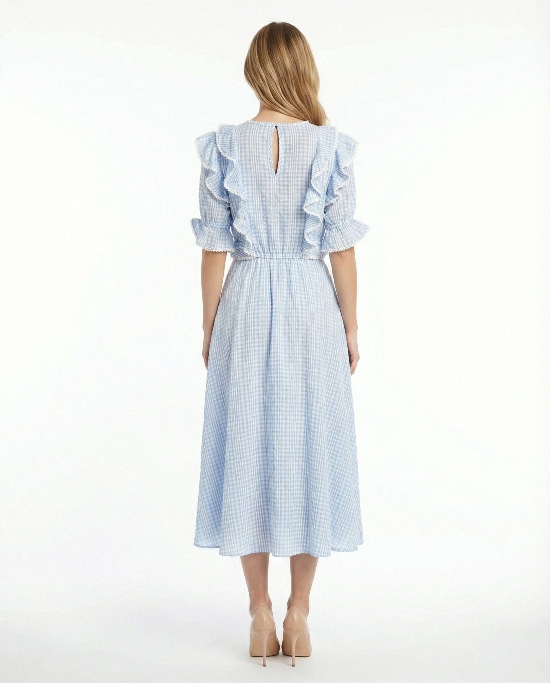 Vestido largo confeccionado en poliéster de alta calidad que combina elegancia y comodidad. Diseño exclusivo con volantes estratégicamente distribuidos que añaden movimiento y sofisticación a la prenda.