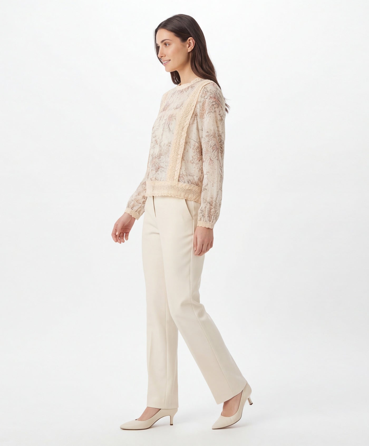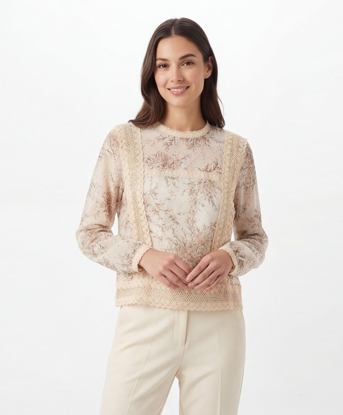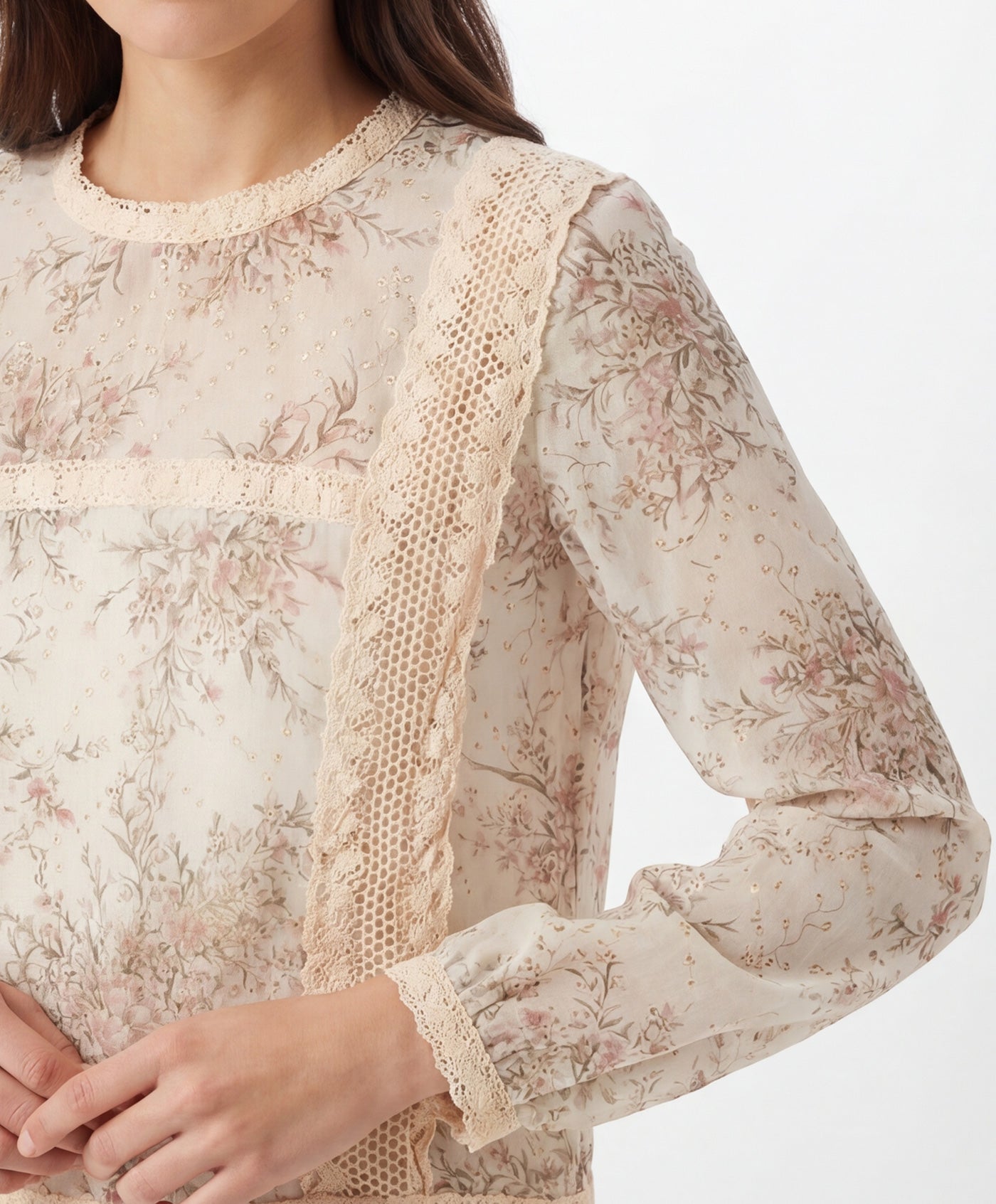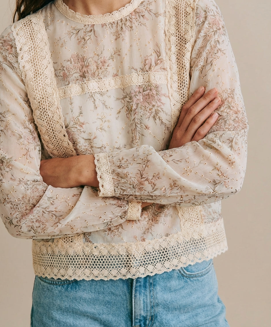 Presenta un delicado estampado floral en tonos suaves que aporta luminosidad al diseño. Cuello redondo con detalle de encaje que realza el acabado sofisticado de la prenda. Incorpora aplicaciones de encaje vertical y horizontal en el frontal que añaden textura y distinción. Mangas largas semitransparentes con puño ligeramente fruncido para un ajuste cómodo.