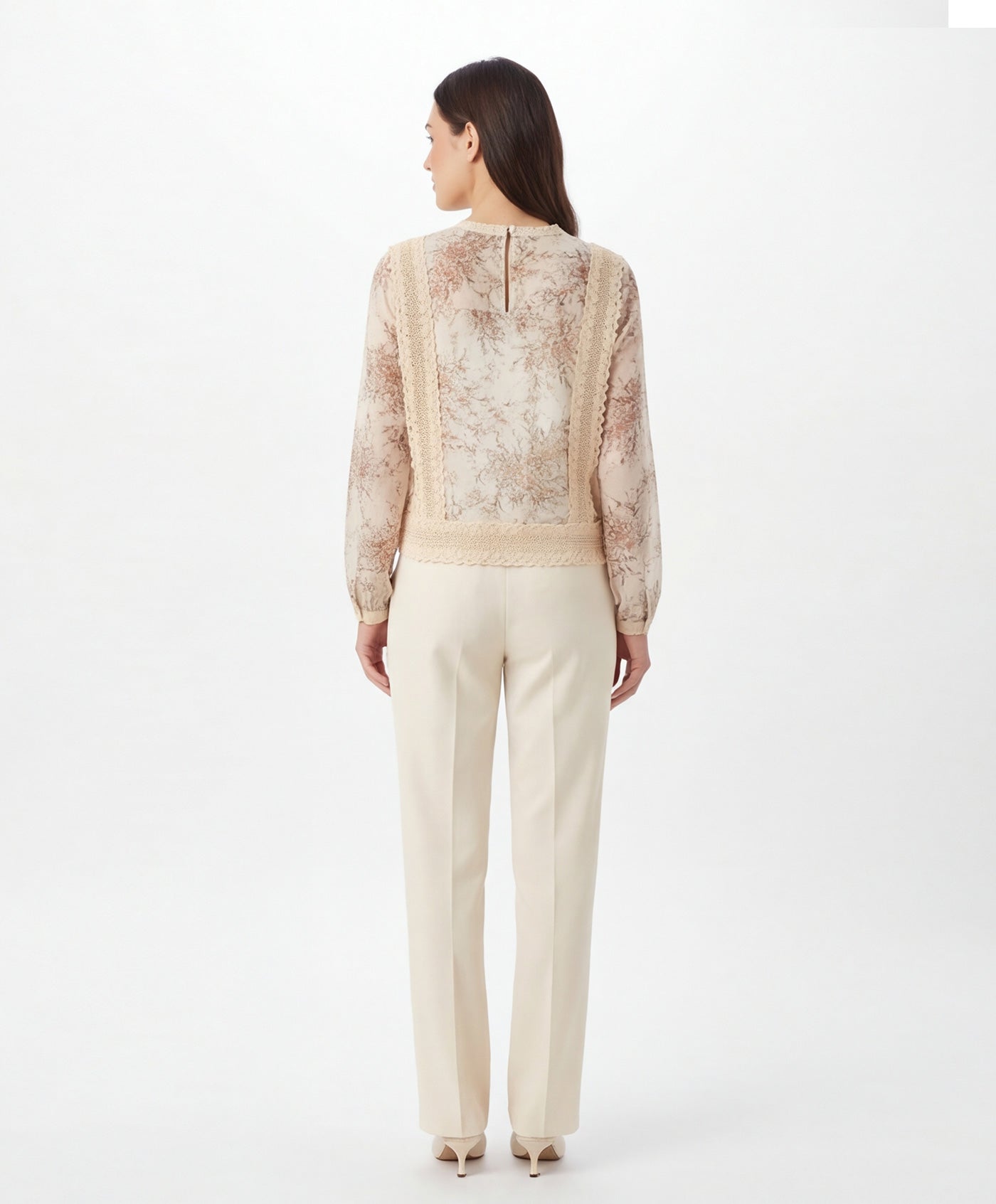 Corte recto con bajo rematado en encaje, que define la silueta sin ajustar. Cierre posterior con pequeña abertura y botón. Un top versátil y refinado, perfecto para combinar con pantalones de vestir o faldas para ocasiones especiales.